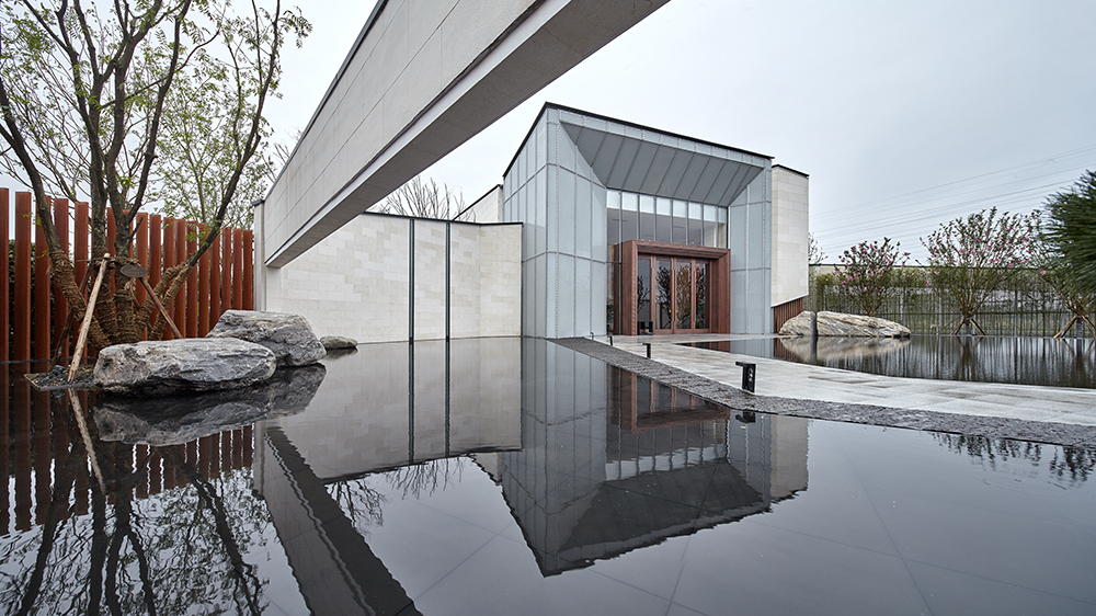 建筑布置在街角处,与示范区入口形成一个L型的半围合空间,建筑布局采用中式传统庭院设计手法(纵深造景形式)。并结合中式建筑的次序感以及中式园林景观中的多种造景手法,打造出一个恬静惬意的内部庭院空间。景墙的高低变化与建筑外立面相互呼应,同时又低调内敛的与周边的自然环境融入,院子中央的建筑两层高,对景敞开的院子。