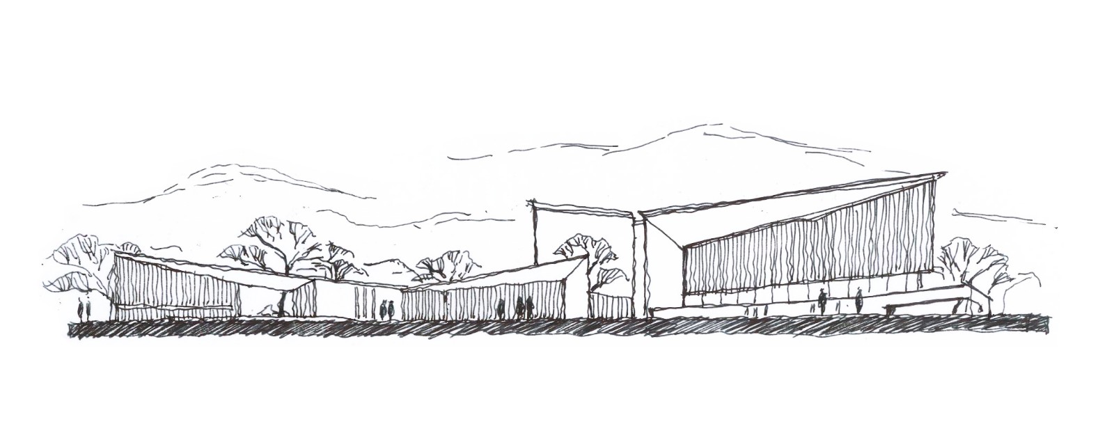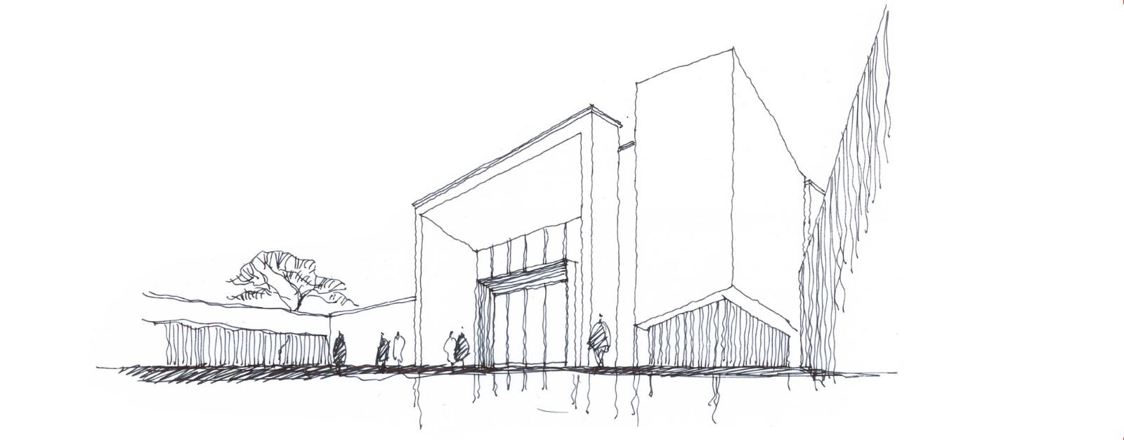 当人们穿过展示区主入口空间,对面的建筑的豁然开朗,安静站立于一片薄薄的静水面前。建筑主体采用矩形布局形式,用大手笔将建筑外立面切割成几个体块,形体上适当脱开、街角处适当提高,结合高低虚实的景墙,一组当代徽派建筑韵味的建筑自然生成!同时也采用虚实结合的手法,丰富的立面元素及材料,强化了“徽州印象”。