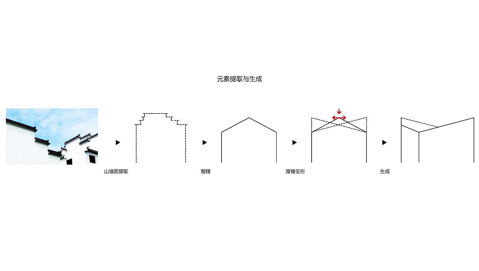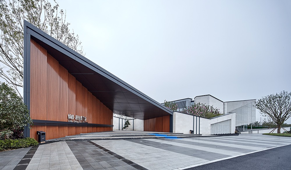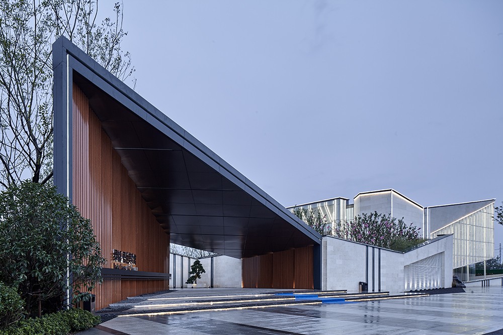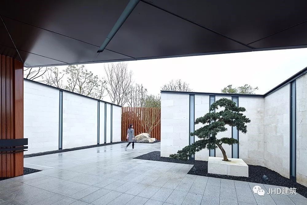 设计时提取了徽派建筑特有的马头墙,高低错落变化的形式,将售楼处建筑屋檐做成简洁的坡屋面形式,从而使得建筑的形体感更加强烈,做到简而不凡。形成富有韵律的天际线。屋檐采用形简洁的金属深灰色。搭配主立面的白色石材,强化了徽派建筑特有的白墙灰瓦这一概念气质印象。