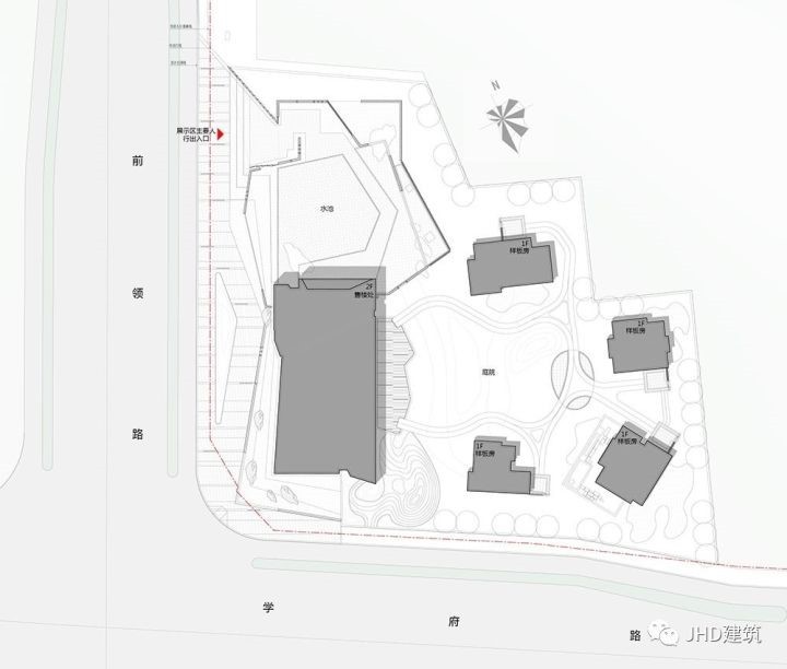 为了打造一个具有徽派文化的气质,在建筑入口处加以适当的处理,采用围合手法,形成一个小村落的入口,把徽派建筑那些复杂的砖雕木雕工艺削减去除,用白墙、木格栅稍作遮挡,打破传统中式建筑对称观念,将整个示范区的入口布置成斜向不对称形式,形成一个引人入胜的入口空间。人们在穿过曲折的空间,经过小桥流水,来到主体建筑前。