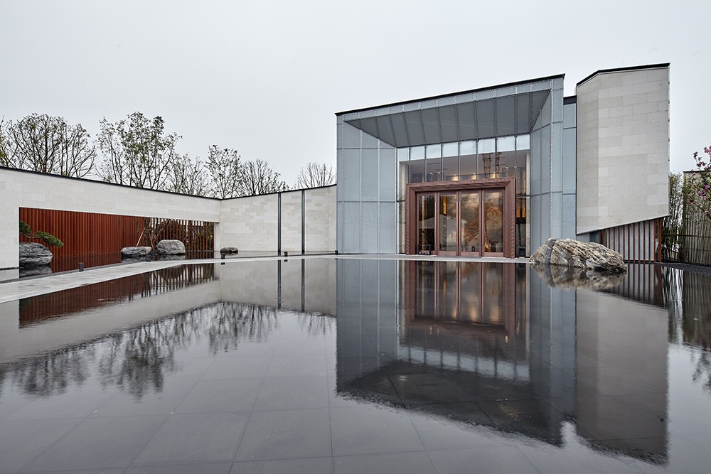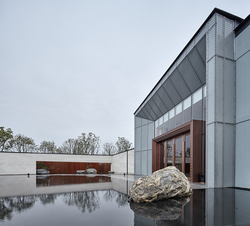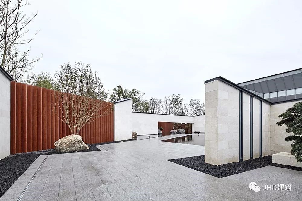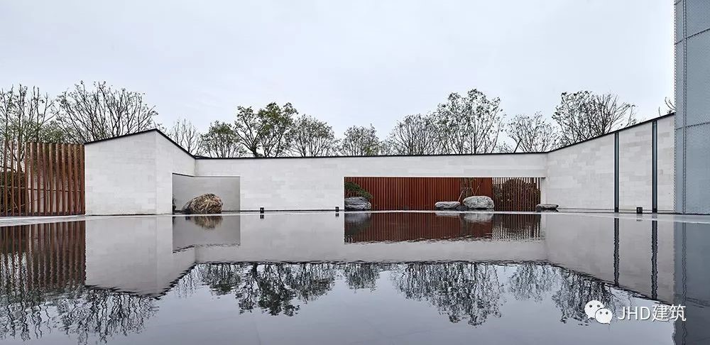 入口庭院比例与尺度经过严格的推敲,做到围而不堵、敞而不空的空间形态,让院子里的人们非常自然的具有停留感,心净、志远。中央景观区,作为建筑及景观的视觉中心,设计了丰富的层次感,由高低不等的雕塑,景观石,及狭长的无边景观池,有层次的铺地设计组成,体现雅致清新的现代中式景观,远处对应的景墙及景观树木若隐若现,近处云片状的建筑在中心庭院静水池的倒影下刻画出一幅颇具东方韵味的”印象徽州“。在色彩的搭配上也主要以朴素淡雅的色调为基础,搭配上木材质及紫铜色的运用就形成了赏心悦目的效果。形成良好的协调感及韵律感。