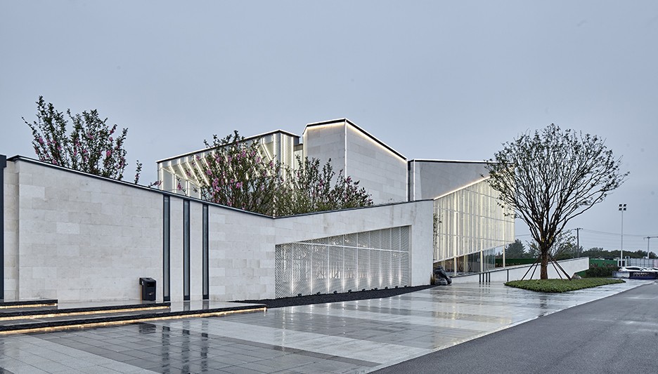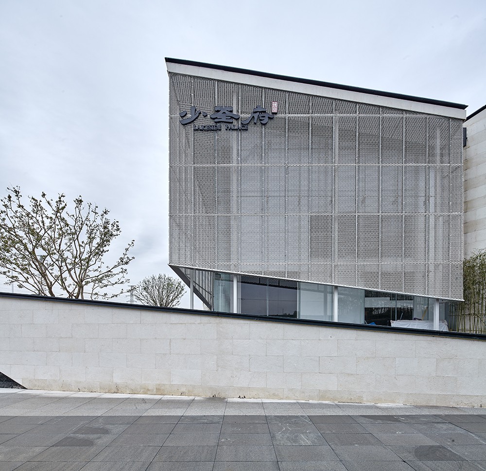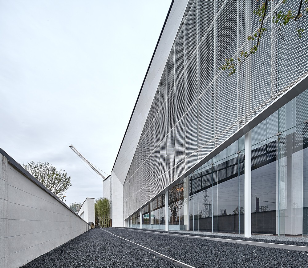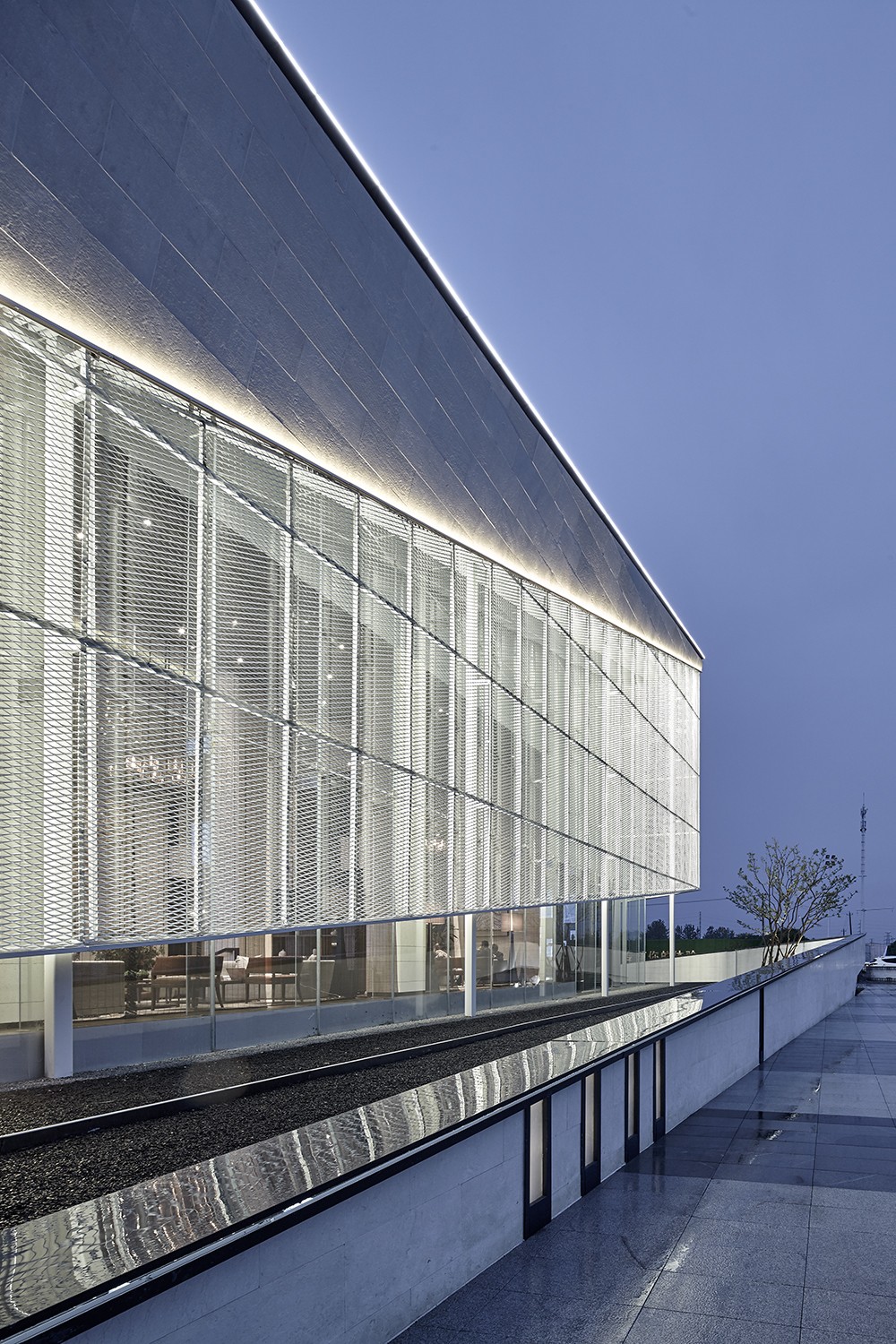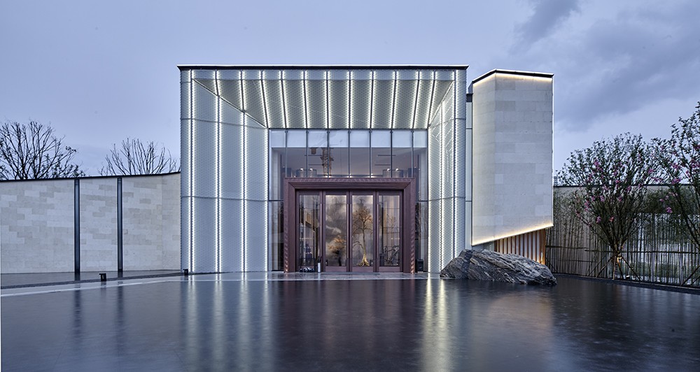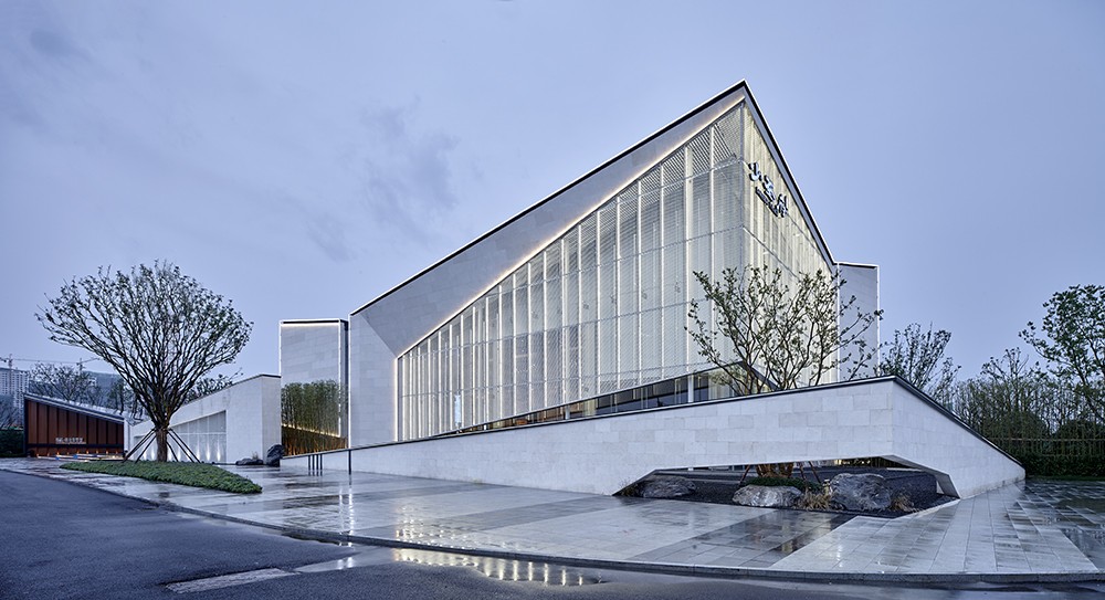 为了筑就独具魅力的质朴实墙,融入新中式的建筑风格中。简洁的建筑形体,虚实结合的立面效果,现代的材料和工艺做法,试图创造出轻盈的、富有变化的以及充满现代感的中式立面效果。建筑材料,以深灰色铝板,白色的石材为主要基调,加上银灰色金属格栅网、配以及仿木纹金属铝板及铜板作为点缀,形成视觉焦点,起到画龙点睛的作用。不同材料的组合,强化了空间的本质,符合徽派建筑内敛,谦逊的气质。主体实墙面以斜向线条为主,光滑的石材质感更是加强了白墙的效果,使立面更加丰富生动。建筑主立面采用金属张拉网结合超白玻璃高透的材料,与石墙面形成强烈的虚实对比,华灯初上,给建筑增加一抹别样的风采。